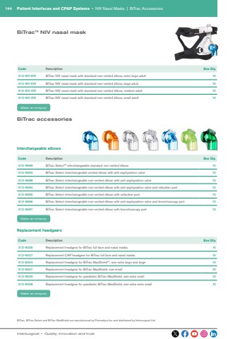 144Intersurgical • Quality, innovation and trustPatient Interfaces and CPAP Systems • NIV Nasal Masks | BiTrac AccessoriesBiTrac™ NIV nasal maskBiTrac accessoriesCode Description Box Qty.313-9016W BiTrac NIV nasal mask with standard non-vented elbow, extra large adult 10313-9015W BiTrac NIV nasal mask with standard non-vented elbow, large adult 10313-9014W BiTrac NIV nasal mask with standard non-vented elbow, medium adult 10313-9013W BiTrac NIV nasal mask with standard non-vented elbow, small adult 10Interchangeable elbowsCode Description Box Qty.313-9599 BiTrac Select™ interchangeable standard non-vented elbow 10313-9593 BiTrac Select interchangeable vented elbow with anti-asphyxiation valve 10313-9598 BiTrac Select interchangeable non-vented elbow with anti-asphyxiation valve 10313-9594 BiTrac Select interchangeable non-vented elbow with anti-asphyxiation valve and nebuliser port 10313-9595 BiTrac Select interchangeable non-vented elbow with nebuliser port 10313-9596 BiTrac Select interchangeable non-vented elbow with anti-asphyxiation valve and bronchoscopy port 10313-9597 BiTrac Select interchangeable non-vented elbow with bronchoscopy port 10Replacement headgearsCode Description Box Qty.313-9026 Replacement headgear for BiTrac full face and nasal masks 10313-9027 Replacement CAP headgear for BiTrac full face and nasal masks 10313-8344 Replacement headgear for BiTrac MaxShield™, size extra large and large 10313-8347 Replacement headgear for BiTrac MaxShield, size small 10313-9529 Replacement headgear for paediatric BiTrac MaxShield, size extra small 10313-9528 Replacement headgear for paediatric BiTrac MaxShield, size extra extra small 10BiTrac, BiTrac Select and BiTrac MaxShield are manufactured by Pulmodyne Inc and distributed by Intersurgical Ltd.Make an enquiryMake an enquiryMake an enquiry
