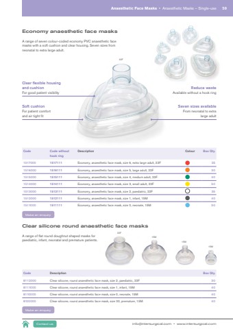 59info@intersurgical.com • www.intersurgical.com15M15M15MClear silicone round anaesthetic face masksA range of flat round doughnut shaped masks for paediatric, infant, neonatal and premature patients.Code Description Box Qty.8112000 Clear silicone, round anaesthetic face mask, size 2, paediatric, 22F 308111000 Clear silicone, round anaesthetic face mask, size 1, infant, 15M 408110000 Clear silicone, round anaesthetic face mask, size 0, neonate, 15M 408100000 Clear silicone, round anaesthetic face mask, size 00, premature, 15M 40Anaesthetic Face Masks • Anaesthetic Masks – Single-useCode Code without hook ringDescription Colour Box Qty.1517000 1517111 Economy, anaesthetic face mask, size 6, extra large adult, 22F 251516000 1516111 Economy, anaesthetic face mask, size 5, large adult, 22F 301515000 1515111 Economy, anaesthetic face mask, size 4, medium adult, 22F 401514000 1514111 Economy, anaesthetic face mask, size 3, small adult, 22F 501513000 1513111 Economy, anaesthetic face mask, size 2, paediatric, 22F 351512000 1512111 Economy, anaesthetic face mask, size 1, infant, 15M 401511000 1511111 Economy, anaesthetic face mask, size 0, neonate, 15M 50Soft cushionFor patient comfort and air tight fitClear flexible housing and cushionFor good patient visibilitySeven sizes availableFrom neonatal to extra large adult22FEconomy anaesthetic face masksA range of seven colour-coded economy PVC anaesthetic face masks with a soft cushion and clear housing. Seven sizes from neonatal to extra large adult.Reduce wasteAvailable without a hook ring22FContact usMake an enquiryMake an enquiry